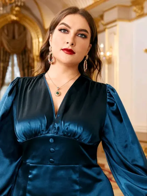 Elegante vestido de talle alto. Elegante vestido de talle alto y manga larga en color azul. Material satén, manga tipo obispo y corte recto. Con botones y cierre.