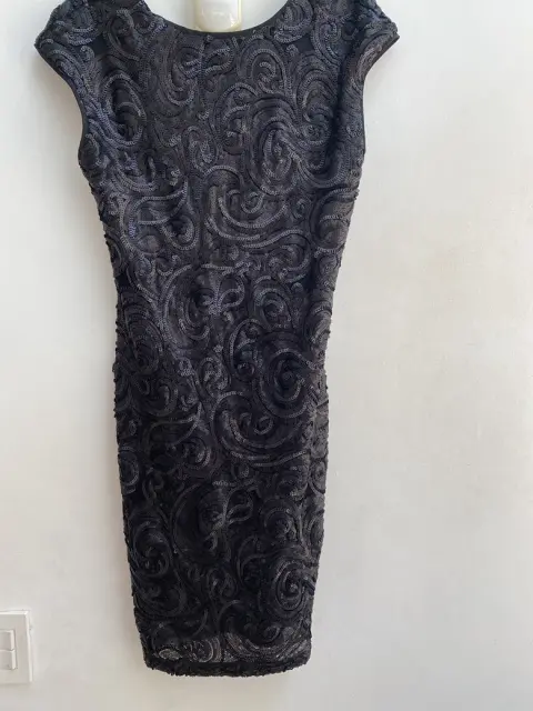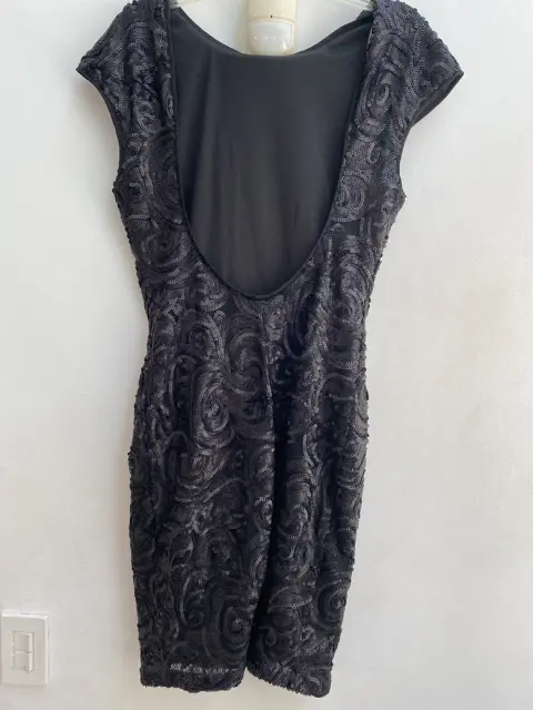 Elegante vestido negro de cocktail con espalda descubierta y aplicaciones de lentejuela. 100% poliéster