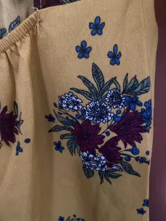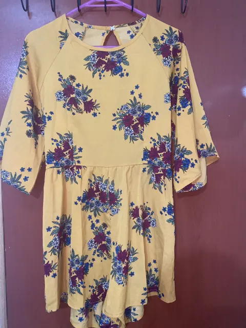 Falda short flores. Mono con short Espalda descubierta Talla mediana 30 a 32 Color amarillo mostaza con flores en tonos vino Muy bonito y apto para esta primavera