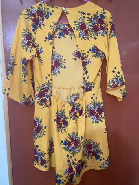 Mono con short Espalda descubierta Talla mediana 30 a 32 Color amarillo mostaza con flores en tonos vino Muy bonito y apto para esta primavera