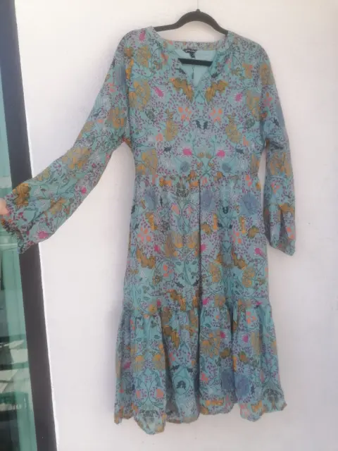 Hermoso vestido talla M (10), color verde tipo turquesa apagado, con flores de colores amarillo, rosa fiusha y naranja.