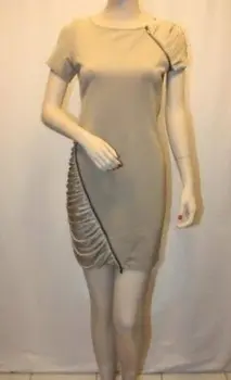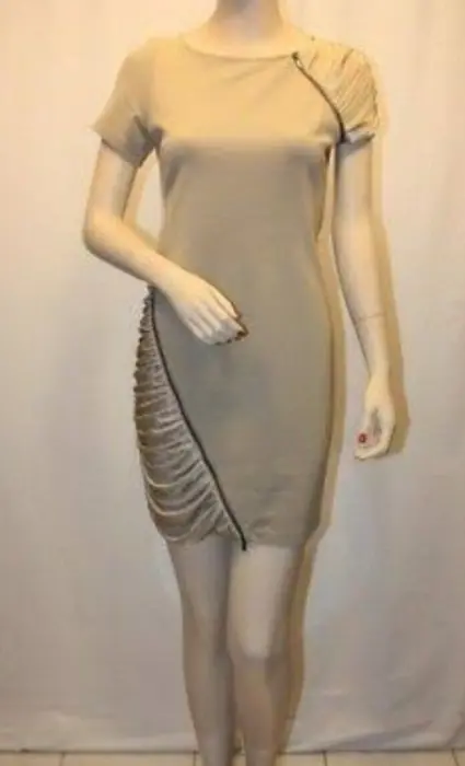 Hermoso vestido color beige con aplicaciones en el mismo tono pero satinadas cierres en el hombro y cadera