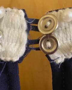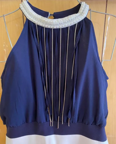 Hermoso vestido con cuello tipo halter con perlas color azul con blanco Está completamente nuevo solo que de tenerlo guardado un resorte de los botones se está jalando anexo foto
