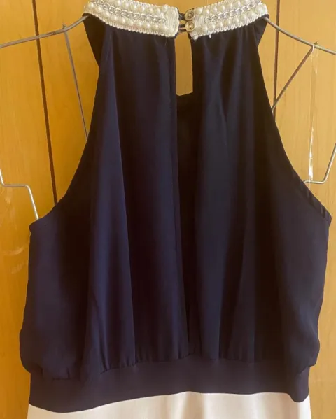 Hermoso vestido azul con blanco. Hermoso vestido con cuello tipo halter con perlas color azul con blanco Está completamente nuevo solo que de tenerlo guardado un resorte de los botones se está jalando anexo foto