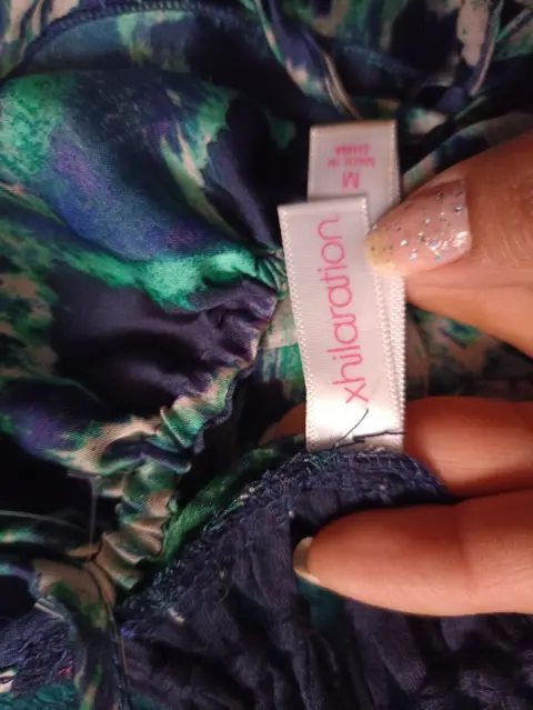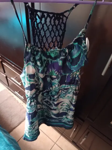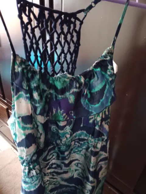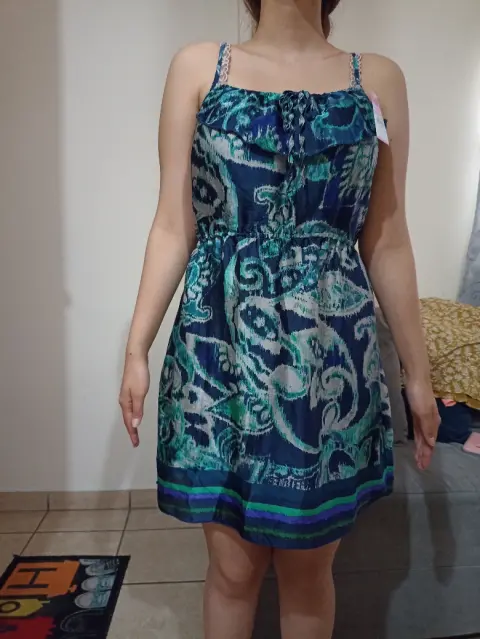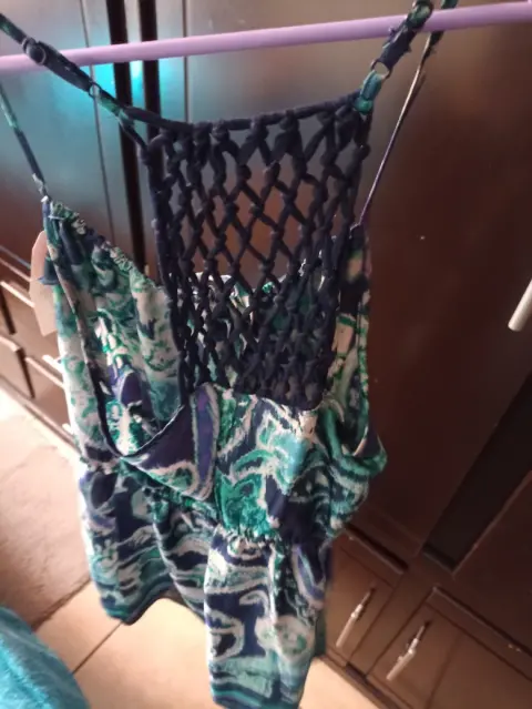 Hermoso vestido azul con verde. Vestido corto, ligero, tela tipo seda, en la parte de atrás tiene un tejido de reja que luce mucho