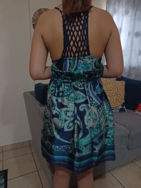 Vestido corto, ligero, tela tipo seda, en la parte de atrás tiene un tejido de reja que luce mucho