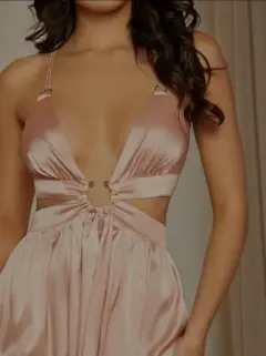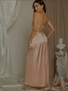 Hermoso vestido de fiesta. Hermoso y sexy vestido de fiesta en color albaricoque. Liso, con espalda descubierta y un aro al frente. Top y falda semi separados. Con tirantes finos y talle alto. Largo y con abertura en la pierna. Tejido elástico ligero. Material satén. 96% poliéster, 4% elastano.