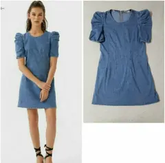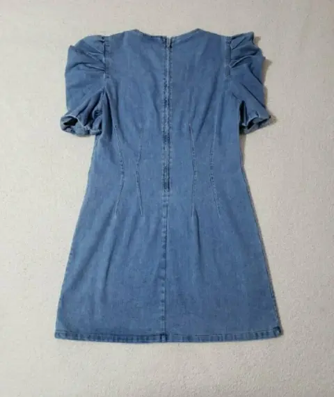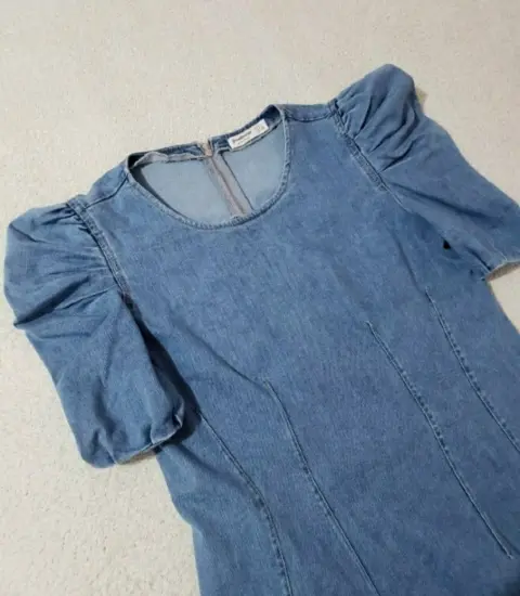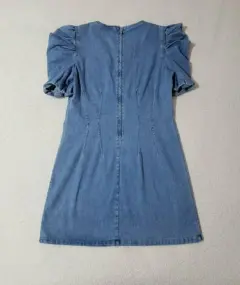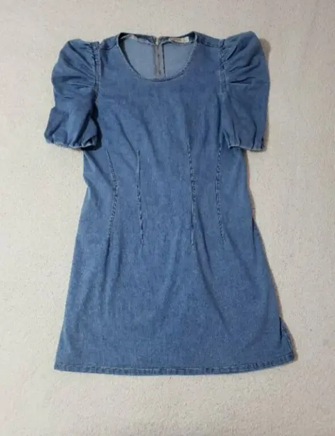 Hermoso vestido de mezclilla, manga abullonada, cuello redondo, cierre trasero, color medio, medidas: hombro a hombro 36cm, axila a axila 48cm, largo 84cm