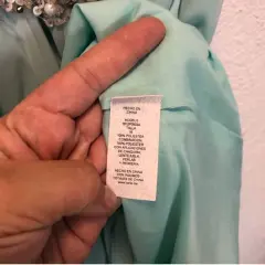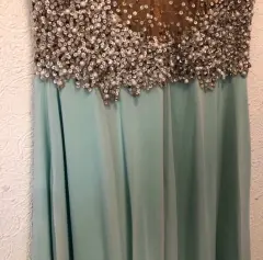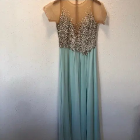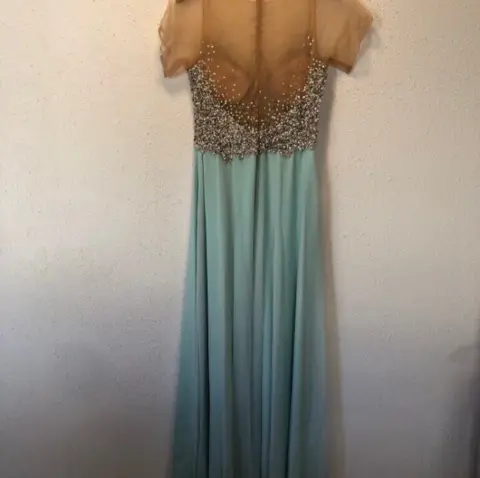 Hermoso vestido 👗 largo. Increíble tono, hermosa caída , pedrería fina, tela fina con forro , mangas y pecho transparentes , cierre en espalda súper cómodo !