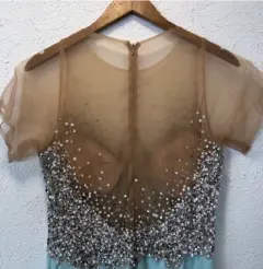 Increíble tono, hermosa caída , pedrería fina, tela fina con forro , mangas y pecho transparentes , cierre en espalda súper cómodo !