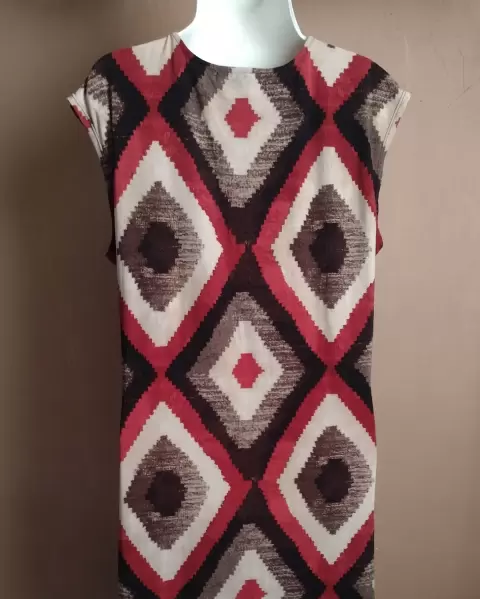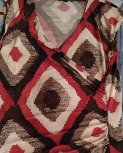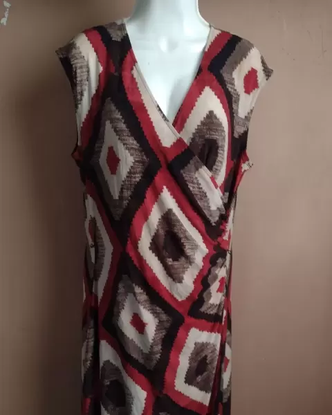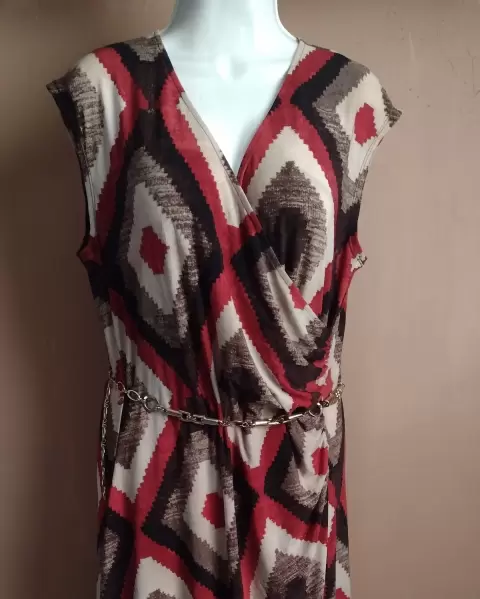 Hermoso vestido de poliéster con spandex, en colores cálidos , largo 1.15 cm talla XL
