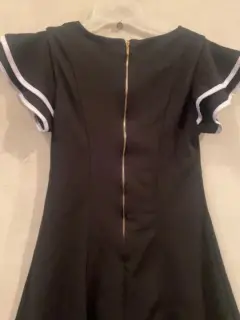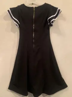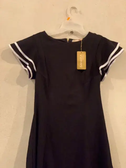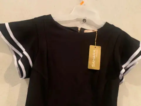 Vestido Negro, con vivos blancos en las mangas con 2 olanes, con cierre atrás del cuello hasta la cadera, con forro.Material: 95% poliéster y 5% elastano.Marca: SAHARA WOMAN