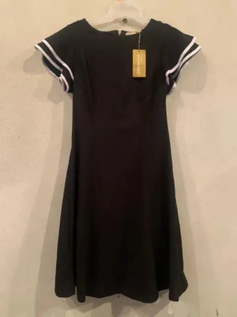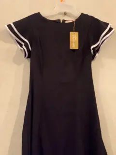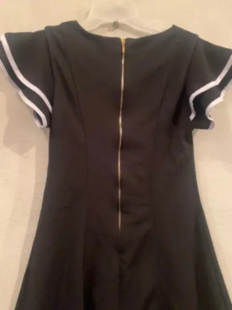 Hermoso Vestido Negro línea A. Vestido Negro, con vivos blancos en las mangas con 2 olanes, con cierre atrás del cuello hasta la cadera, con forro.Material: 95% poliéster y 5% elastano.Marca: SAHARA WOMAN