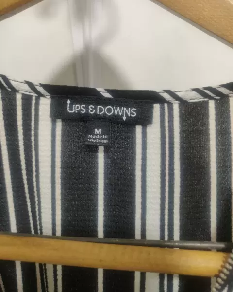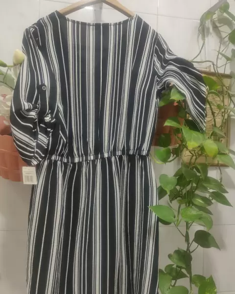 Hermoso vestido nuevo de rayas negras y blancas, verticales por lo que ayuda a la figura.Súper padre! Con cierre al frente y elástico en la cintura.