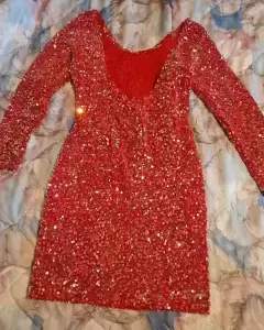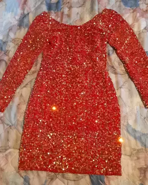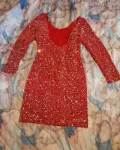 Hermoso vestido nuevo de lentejuelas doradas tornasol en color rojo, unitalla, manga larga, queda como se muestra en la última imagen, se amolda al cuerpo y queda hermoso.