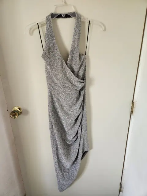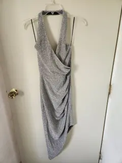 Hermoso vestido plateado. Buen ajuste y super cómodo. Corte diagonal, escote en espalda.