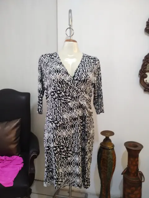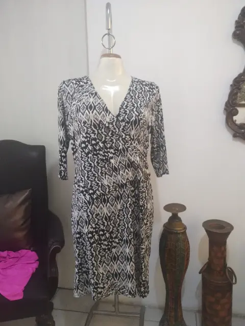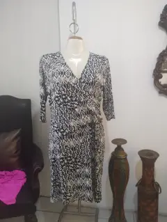 Hermoso vestido, cuello "V" material strech, manga 3/4 queda a la rodilla, es cruzado y ayuda a disimular abdomen.