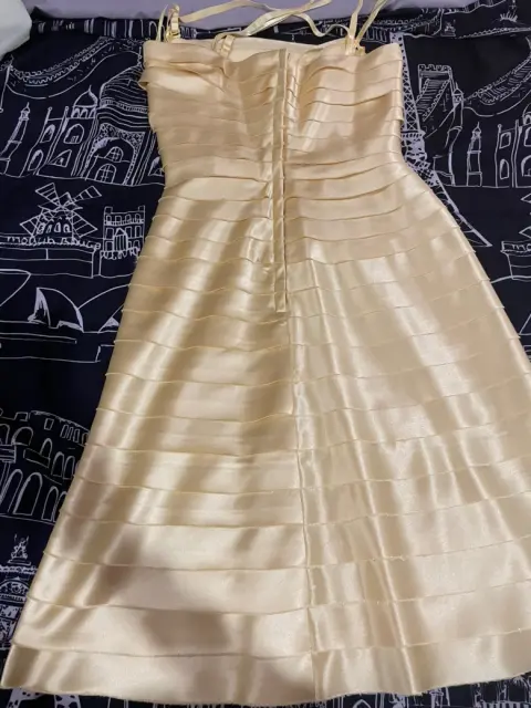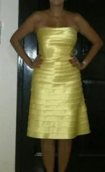 Vestido tipo cóctel, color amarillo, con varillas a los lados para estilizar figura, puedes utilizar con o sin tirantes. Talla 4, marca BCBGMAXAZARIA
