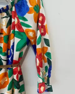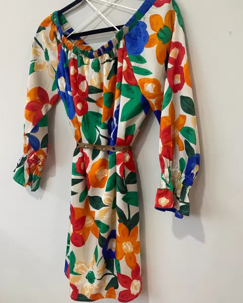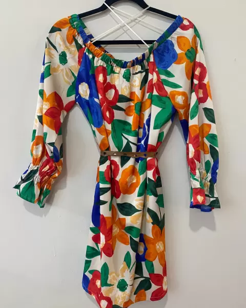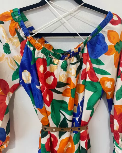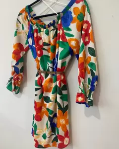 Increíble vestido flores. Maravilloso y bello vestido estampado multicolor de flores mangas muy elegantes con puño elástico, ideal para ocasiones formales elegantes y casuales talla M y también queda a L holgado cómodo y puede lucir muy lindo con cualquier cinturón (mide 52 de axila a axila y 82 de largo, una puesta