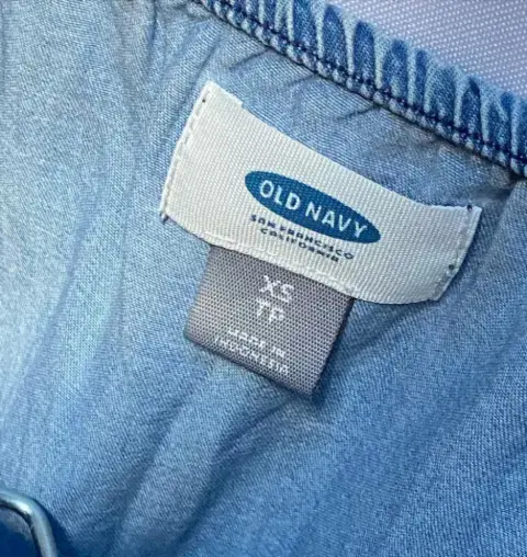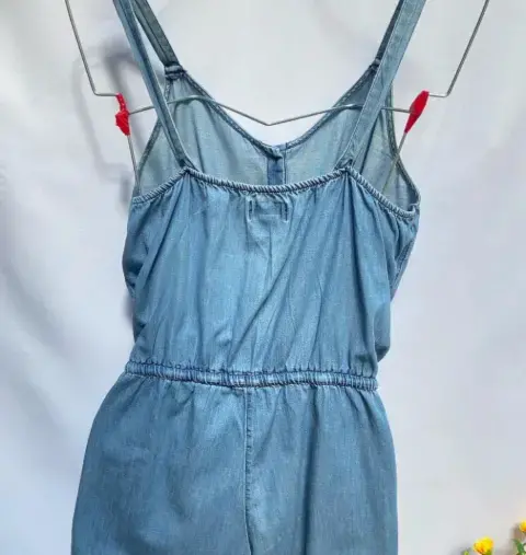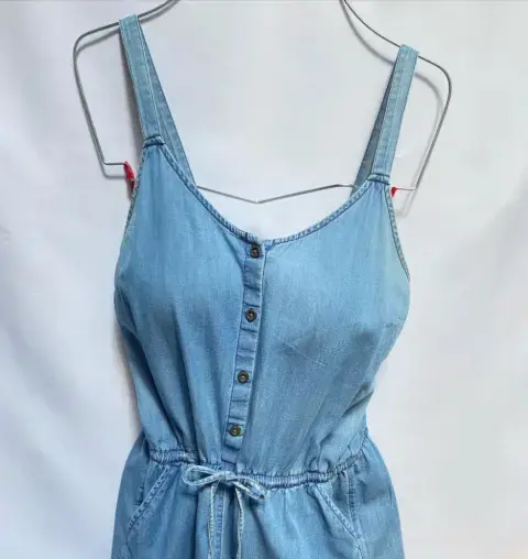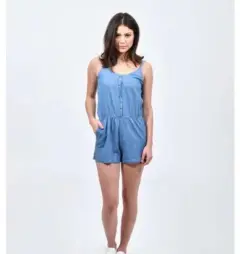 Jumpsuit en mezclilla delgada en azul claro deslavado. Escote redondo, tirantes con botones y ojales ajustables. Corte a la cintura con elástico en ella y cinta ajustable, pinza de busto en costado. Bolsas de cartera. Espalda con elástico en la orilla superior, pequeñas aberturas en los costados del short. Talla: XS (22-24) Puede quedar hasta una talla S. Marca: OLD NAVY.