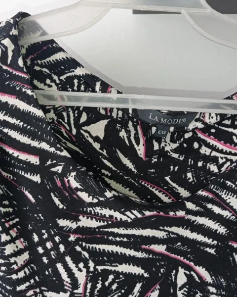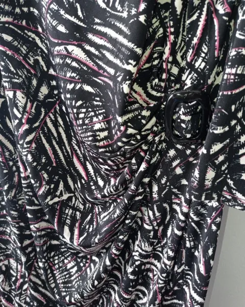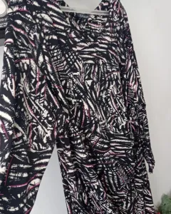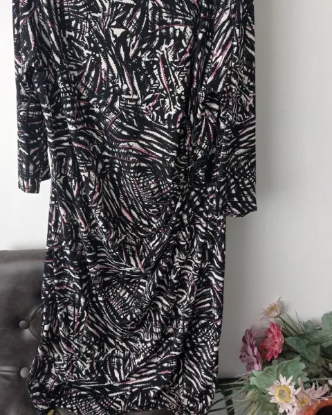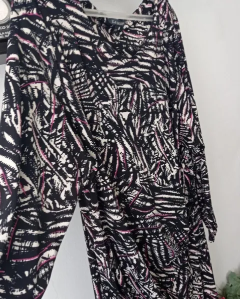 Bonito vestido que se ajusta al cuerpo, sin embargo tiene un pliegue en la cintura que ayuda a disimular el vientre. Su manga larga lo hace elegante. Puede usarse con un blazer negro, blanco o rosa intenso. Sus colores son negro, rosa carmín y blanco. La tela es fresca. Largo 96 cm. Mangas 49 cm.