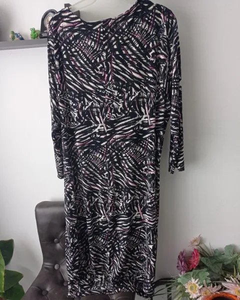 LINDO VESTIDO. Bonito vestido que se ajusta al cuerpo, sin embargo tiene un pliegue en la cintura que ayuda a disimular el vientre. Su manga larga lo hace elegante. Puede usarse con un blazer negro, blanco o rosa intenso. Sus colores son negro, rosa carmín y blanco. La tela es fresca. Largo 96 cm. Mangas 49 cm.