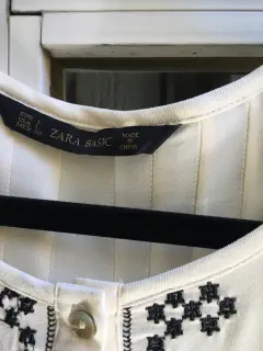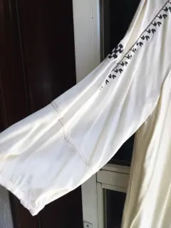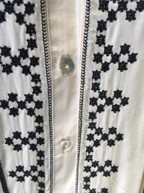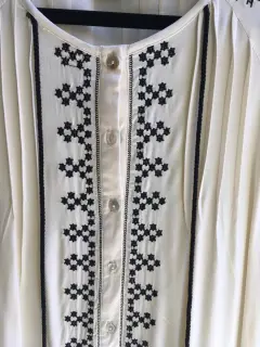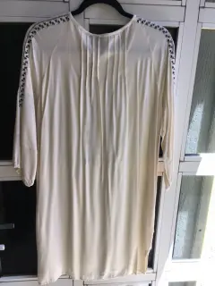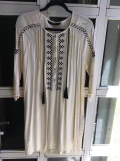 Vestido boho en blanco crudo con bordados en negro. Una hermosa pieza. No usado. Medidas: axilas 58cm, cintura 63cm, cadera 63cm, largo 93cm.