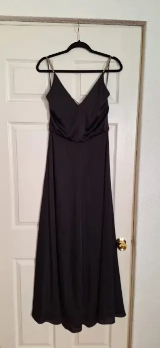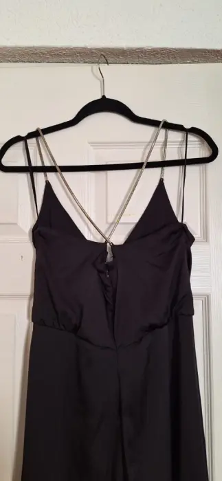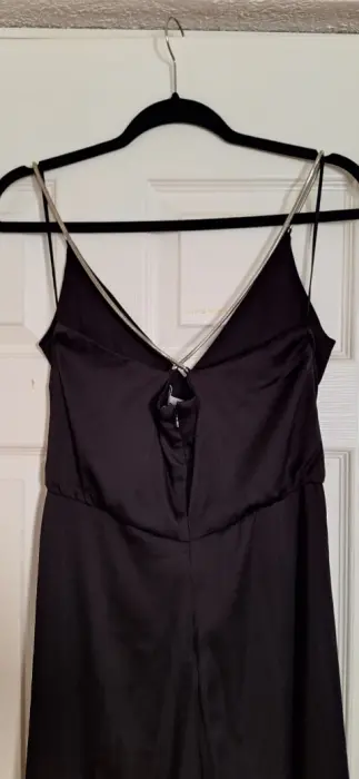 Lindo vestido negro. Una prenda básica y chic, en satín y corte línea A. Con tirantes de metal.