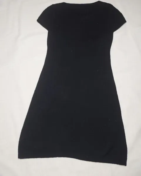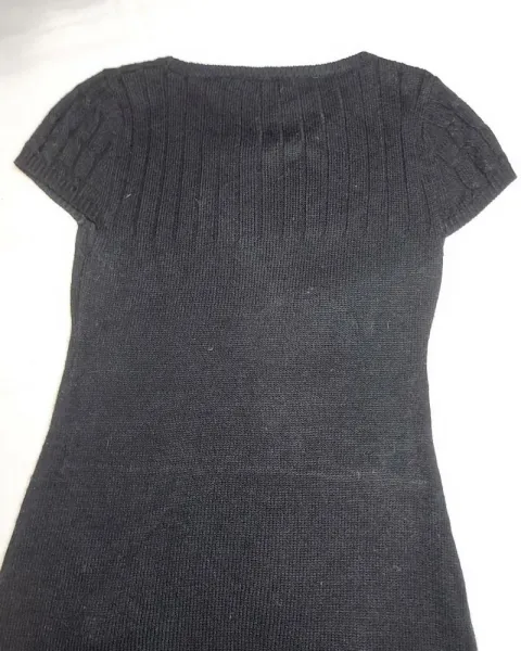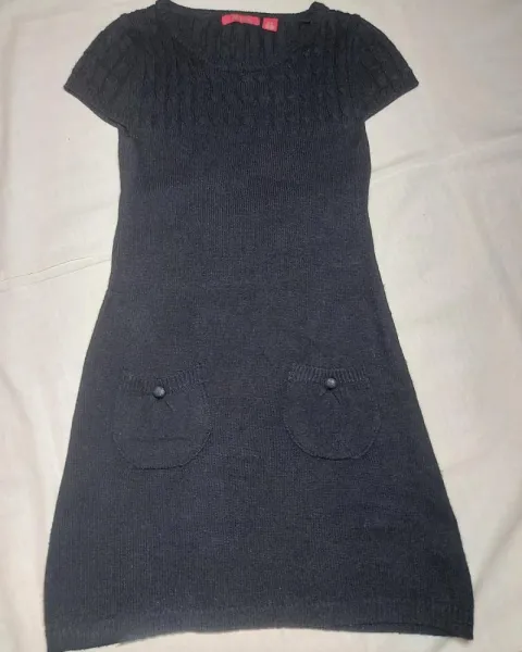 Lindo vestido negro tejido. Hermoso vestido tejido negro, con maga corta, dibujo en el pecho y liso de abajo, con dos bolsas de frente, no ayudan las fotos, no está nada opaco, ni decolorado, está en perfectas condiciones, puesto como 1 o 2 veces, llega arriba de la rodilla. Dice talla M queda a S.