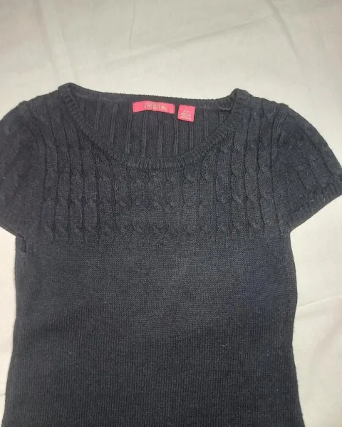 Hermoso vestido tejido negro, con maga corta, dibujo en el pecho y liso de abajo, con dos bolsas de frente, no ayudan las fotos, no está nada opaco, ni decolorado, está en perfectas condiciones, puesto como 1 o 2 veces, llega arriba de la rodilla. Dice talla M queda a S.