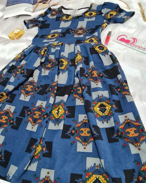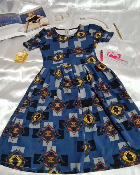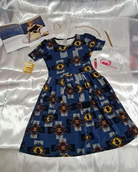 Lula Roe Azul tableado. Vestido LULA ROE en tono azul marino con detalles de triangulos y piramides color crema, negro y naranja. Aponcito de cierre y estira.MedidasTalla XSBusto 82cm a 94cmCintura 74cm a 80cmCadera libreLargo 98CM