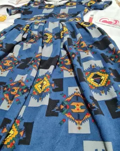 Vestido LULA ROE en tono azul marino con detalles de triangulos y piramides color crema, negro y naranja. Aponcito de cierre y estira.MedidasTalla XSBusto 82cm a 94cmCintura 74cm a 80cmCadera libreLargo 98CM