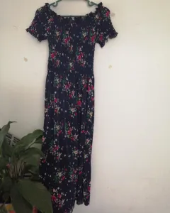 Maxi vestido azul marino con flores , resorte en la parte de la cintura y cuello tipo campesino, se puede bajar para lucir los hombros..Tiene el detalle en la bastilla se le cortó pero no sé nota