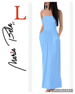 Maxi Vestido strapless con bolsas. Esta Divino!La textura de la tela se siente tipo piel de durazno.Tiene bolsasResorte en la parte de arriba, toda la tela tiene strech.Talla LHorma super bonito.Sin detalles y como Nuevo.1 puesta.