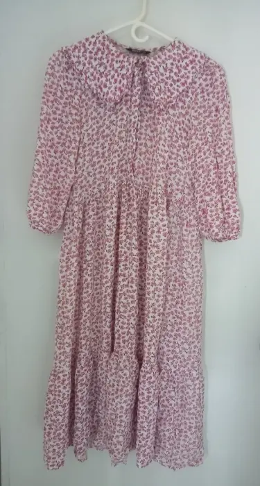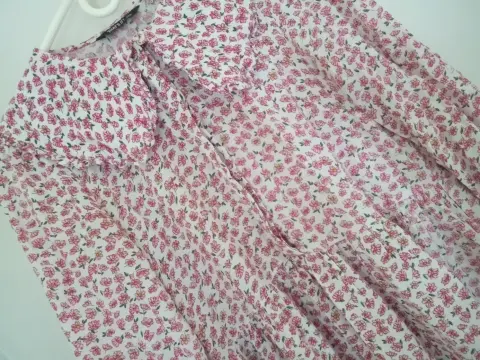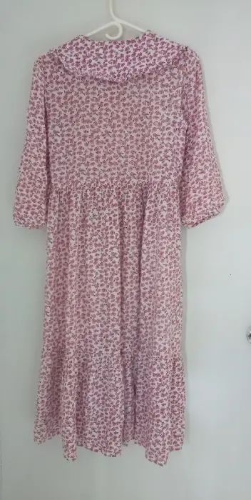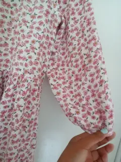 Maxivestido blanco con flores rosa 🛍️. Largo hermoso suelto manga abullonada fresco con cuello de olanes muy combinable queda CH m porque es suelto si te gusta esta prendita sigueme y ve a mi closet hay más cosas lindas♥️🏩🛍️