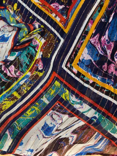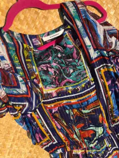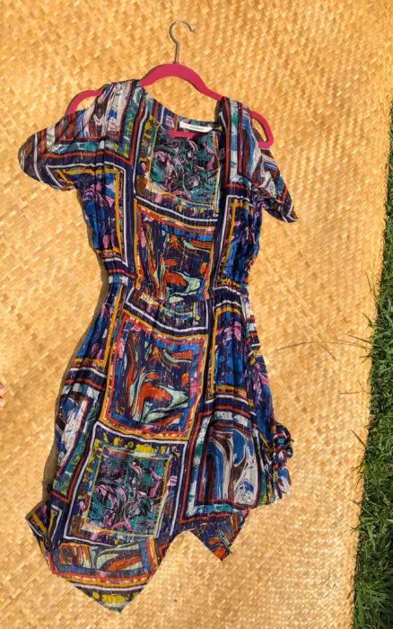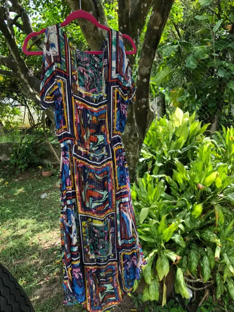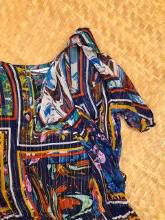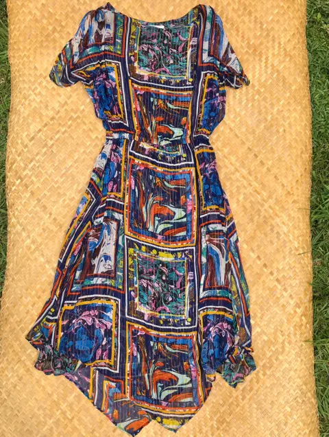 Hermoso vestido midi , estilo suelto bohemio elegante , la tela es viscosa y metálica , los colores están súper intensos , hace una linda figura y la falda tiene terminación de picos
