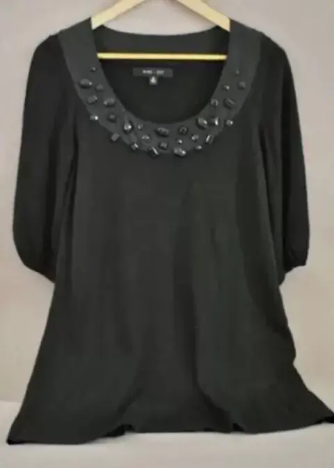 Mini vestido negro con piedras en cuello talla M. Mini vestido negro con piedras en el cuello. Manga bombachas, cuello redondo muy lindo y súper favorecedor.