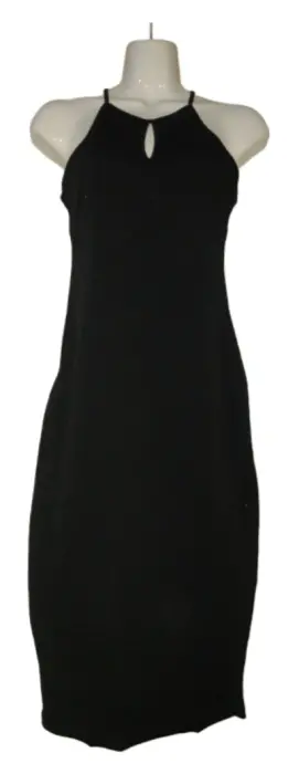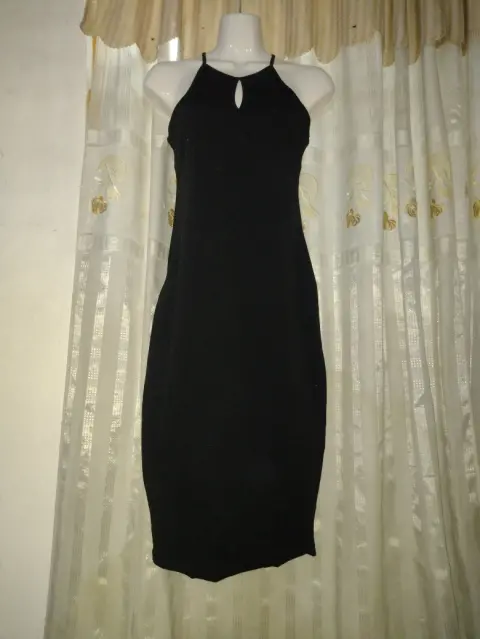 Negro halter tirantes. Lindo vestido negro entallado y largo hasta las pantorrillas con un pequeño escote al pecho acompañado de unas bellas zapatillas y un bolso elegante es perfecto para cualquier evento especial.