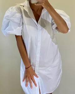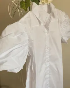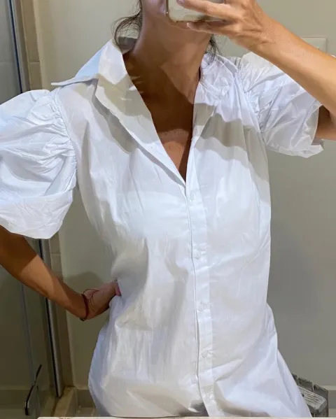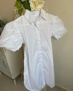 Hermoso camisero con mangas abullonadas blanco, algodón súper fresco y cómodo, abotonado por la parte del frente, queda desde una talla CH a M. Corte en los costados redondeado que estiliza las piernas divino.