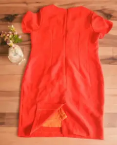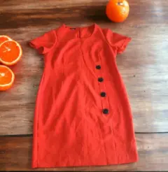 Lindo vestido naranja con botones negros que le dan un toque especial, manga corta, con forro. Ideal para éstas fechas de Halloween y Thanks Giving en la oficina.Axila a axila 58cm, hombros 42cm, largo 97cm, cintura 52cm.