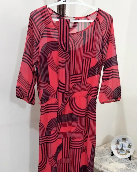 Holgado, manga larga pero de tela delgada, perfecto para entre tiempo con un saco lindo. Viene con un cinturón y la tela es stretch de la cadera