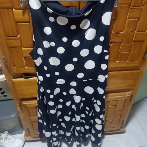 Por divorcio estoy vendiendo ropa. Hermosa vestido línea A. Azul marino con lunares blancos. Cinturón de liston blanco.