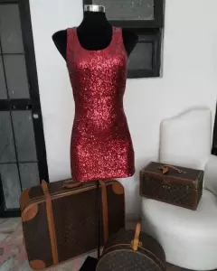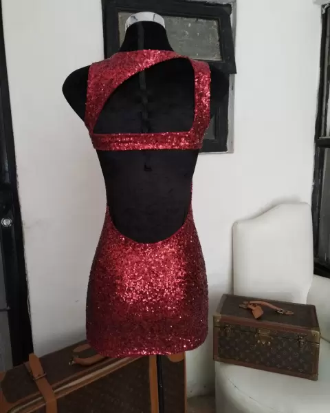 Luce espectacular con este vestido rojo de lentejuelas con la espalda descubierta pero una excelente compresion para ser la reyna de la fiesta. Estira un poco, es para una talla CH-M