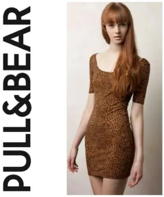 Pull and Bear | Vestido de Leopardo. Vestido stretch de animal print de leopardo, adaptable al cuerpo, cuello redondo, con mangas y cierre en la espalda. Sin detalles, esta en buen estado. Talla Mediana
