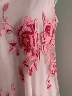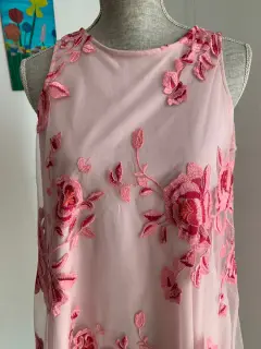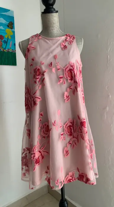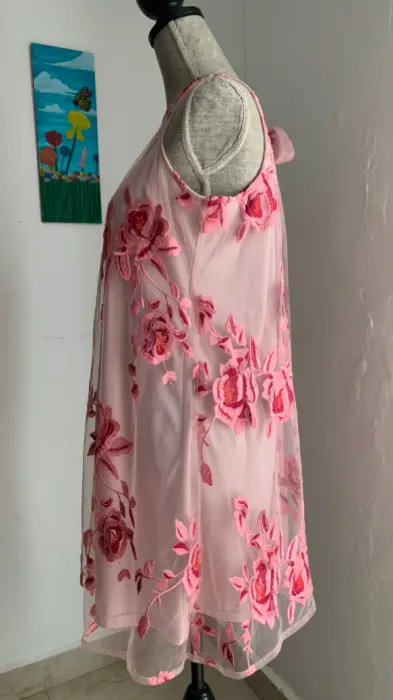 Romántico Vestido Bordado. Bellísimo vestido corto, línea A, de tal transparente col Flores bordadas, y fondo, , con lazo en la espalda para realzarlo con un amarre en Moño.100% poliéster. Axila 52cmCintura 72Largo 87cmTambién queda a talla M