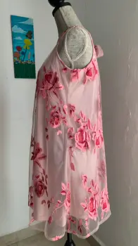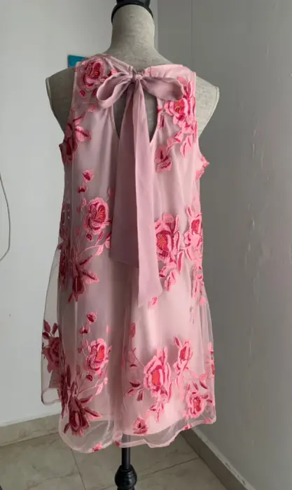 Bellísimo vestido corto, línea A, de tal transparente col Flores bordadas, y fondo, , con lazo en la espalda para realzarlo con un amarre en Moño.100% poliéster. Axila 52cmCintura 72Largo 87cmTambién queda a talla M