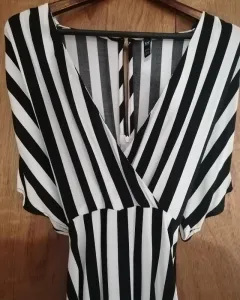 Romper Zara de rayas blancas y negras. Romper de rayas, súper halagador por el corte y estampado. Tiene short abajo de la falda. Sólo lo usé una vez, lo vendo porque ya no me queda. Está como nuevo. Te va a encantar 😊