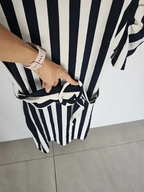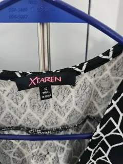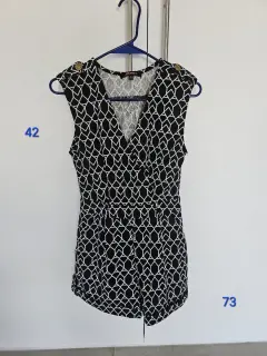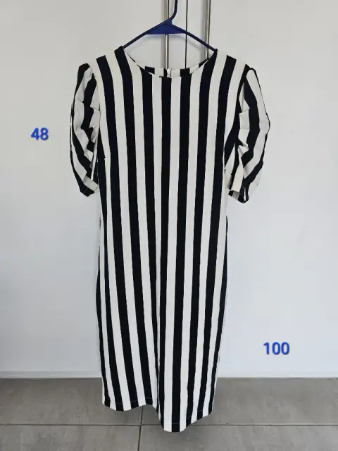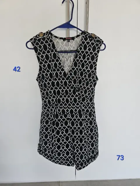 Ambos son talla chica, es un jumpsuit blanco con negro, orma muy padre y el vestido negro es amplia de abajo y tiene pinzas, lo que hace que se amolde micho mejor a tu cuerpo