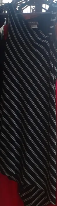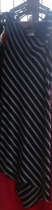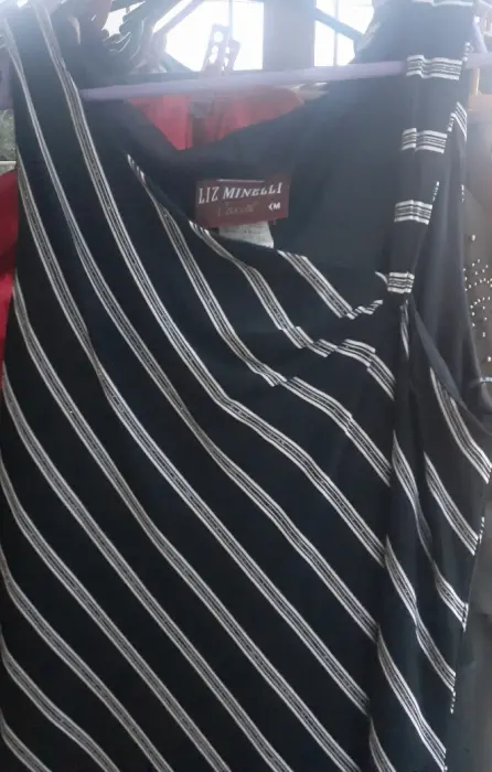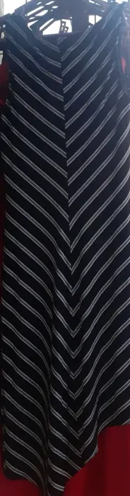 Es un vestido color negro con franjas diagonales blancas es un vestido que da muy bonita forma a tu figura por que es como de tela de licra y también trae forro es un vestido de marca liz minelli es para usarse del diario o en eventos o fiestas esta muy bonito es semi nuevo es un vestido de muy buena calidad