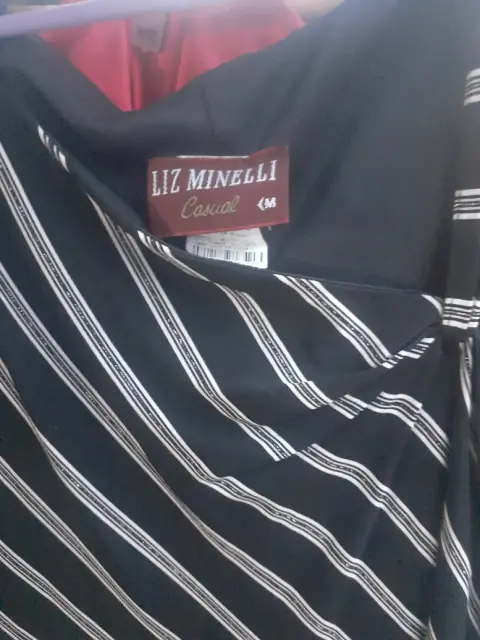 Un vestido para usar en cualquier ocasión. Es un vestido color negro con franjas diagonales blancas es un vestido que da muy bonita forma a tu figura por que es como de tela de licra y también trae forro es un vestido de marca liz minelli es para usarse del diario o en eventos o fiestas esta muy bonito es semi nuevo es un vestido de muy buena calidad